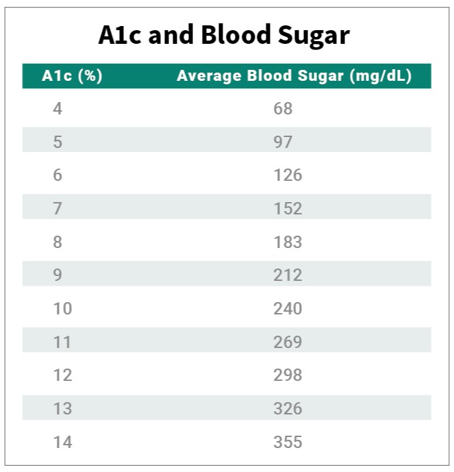 In addition to A1c, time in range (TIR) is another key indicator to blood sugar management. To learn more about time in range check out this blog post. Here is a quick reference on A1c percentages correlated to an average blood sugar.